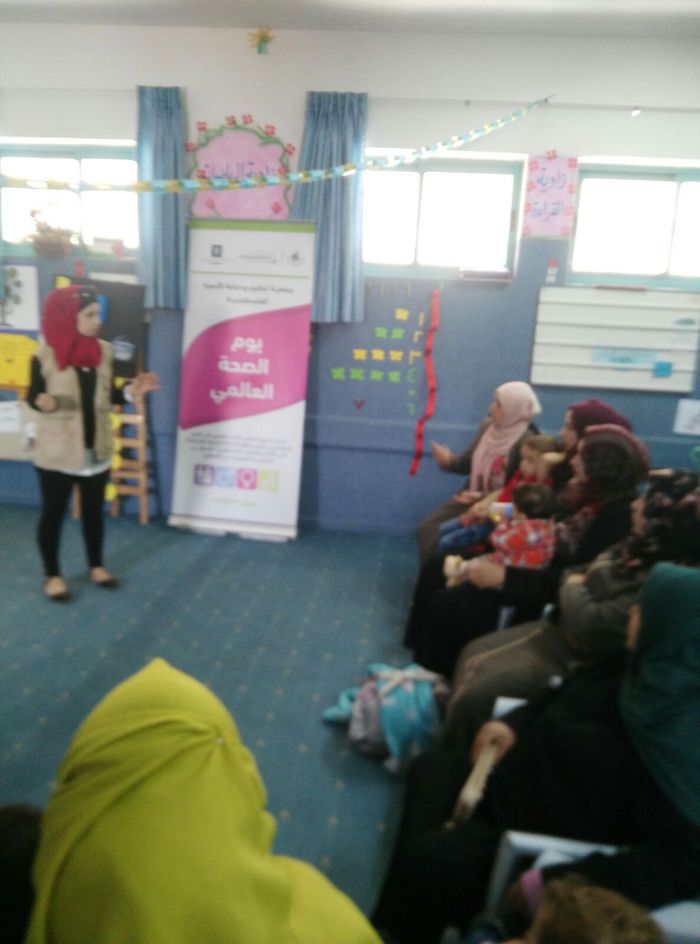 حيث قامت الممرضة فاطمة ابو عواد بالترحيب بالحضور والتعريف عن يوم الصحة العالمي وأهميته. ومن بعدها قامت بتوعية 70طالبة حول تغذية المراهقة، بالإضافة إلى توعية 20سيدة بمخاطر العدوى المنقولة بالجنس. وأيضا قامت الاخصائية الاجتماعية سماح السعدة بتوعية الطالبات حول مرحلة المراهقة من ناحية نفسية واجتماعية وتوعية السيدات بدور الأهل في مرحلة المراهقة. وقام المتطوع ايهاب النتشة بعرض مهارات الاتصال والتواصل.